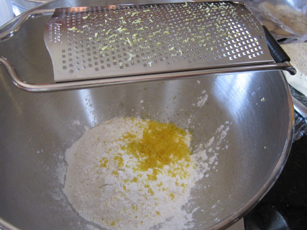 Meanwhile, combine flour, cornstarch, lemon zest, and salt in a large bowl.