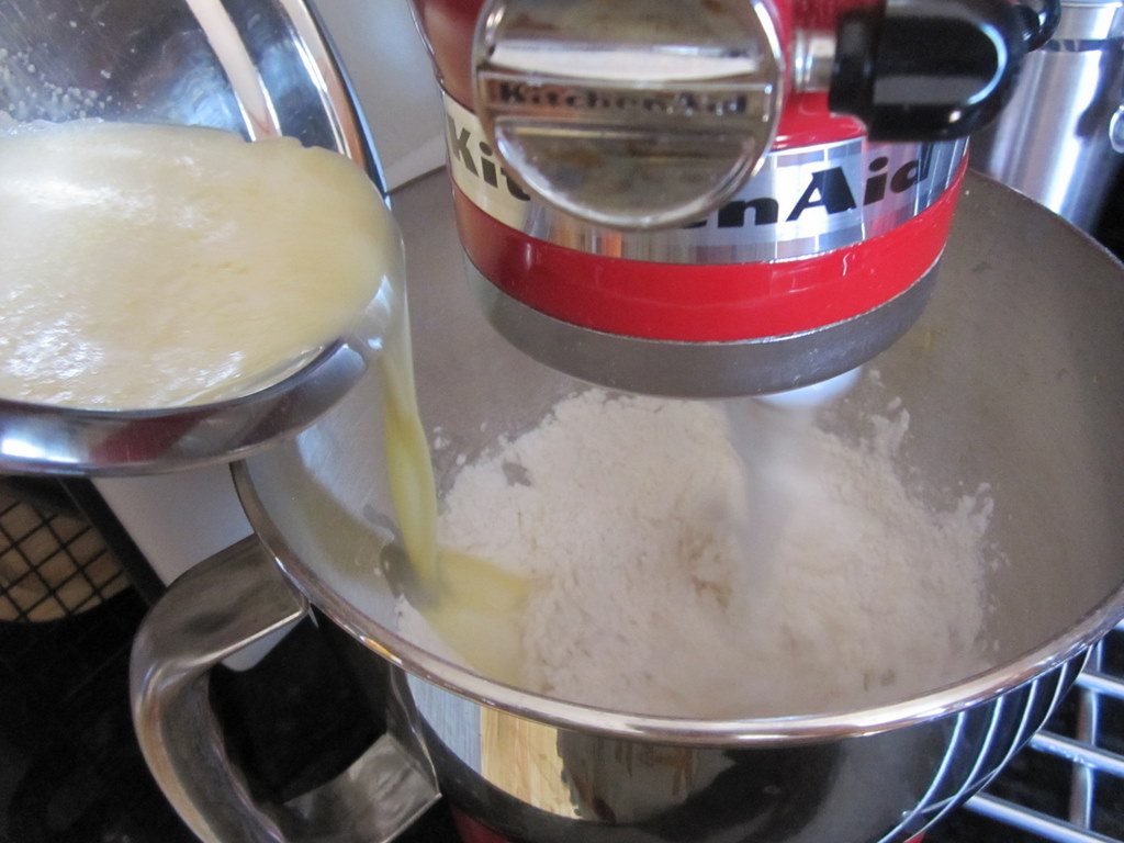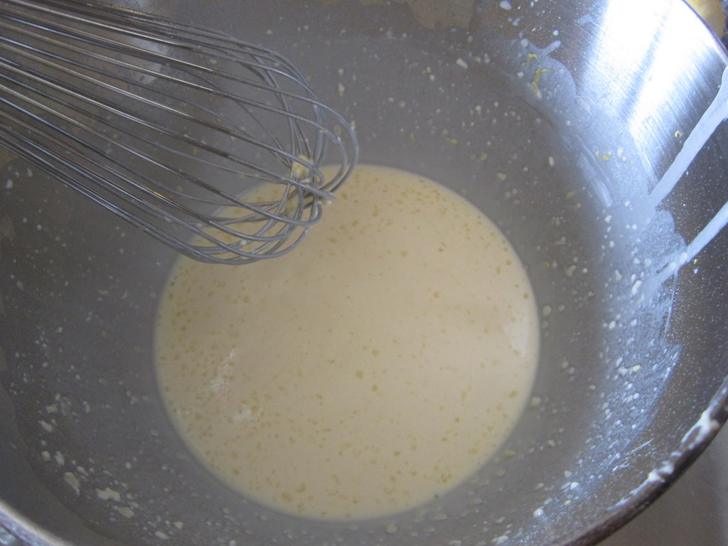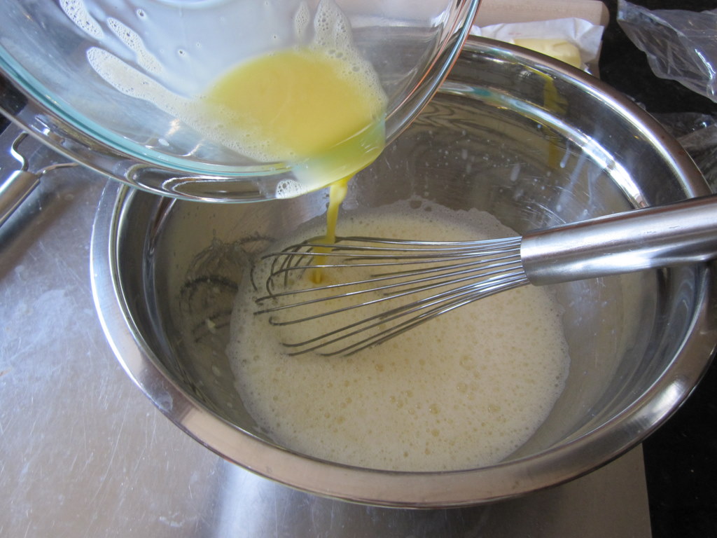 Whisk 1/3 of the milk-egg mixture into flour mixture until no limps remain, then slowly whisk in remaining milk-egg mixture until smooth.