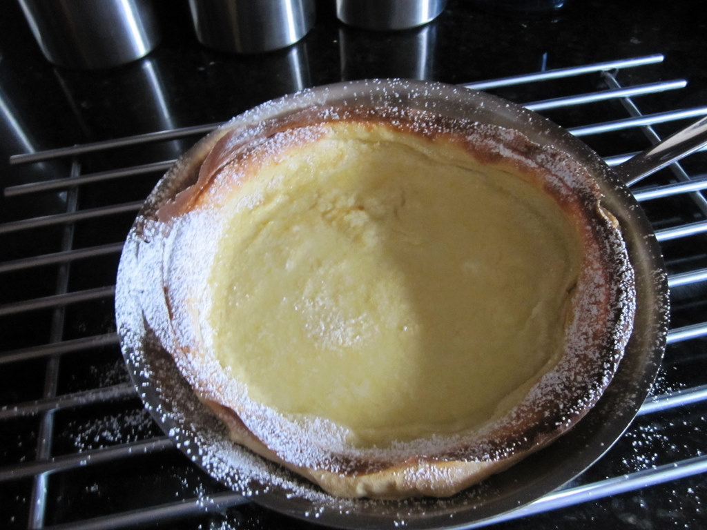 Bake in the oven until the edges of the Dutch baby are deep golden brown and crisp, about 20 minutes. Transfer skillet to a wire rack and sprinkle confectioners’ sugar and lemon juice over the top.