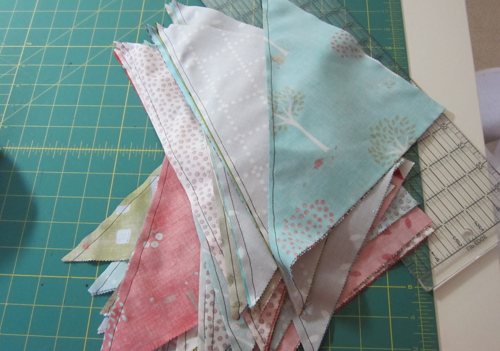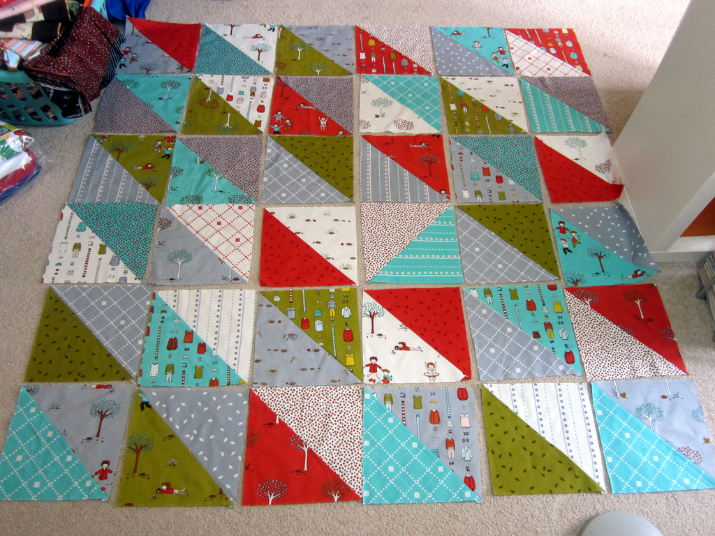 I’m already halfway through piecing the top together, so that part is definitely coming together quickly. I don’t know how long it will take me to finish the complete quilt, and I’m deciding whether or not to add some sashing around the edges of this top with some of the yardage I have from the Little Apples line. I caught that one turquoise square that’s facing the wrong direction and turned it before sewing this up.