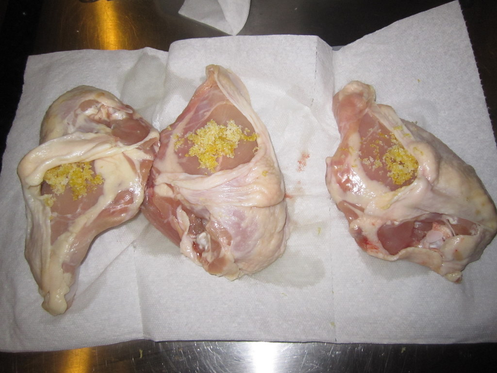 Rub 2 Tbsp zest mixture under skin of the chicken.