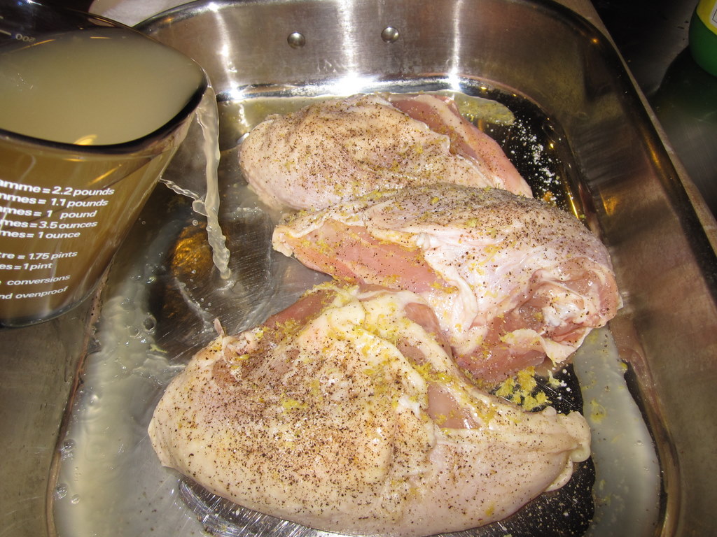 Season chicken with salt and pepper and transfer to roasting pan. (Seasoned chicken can be refrigerated for 2 hours). Whisk broth, 1 cup water, lemon juice, and remaining zest mixture in a 4-cup liquid measuring cup, then pour into roasting pan.