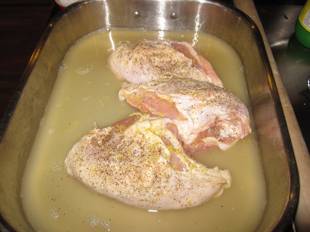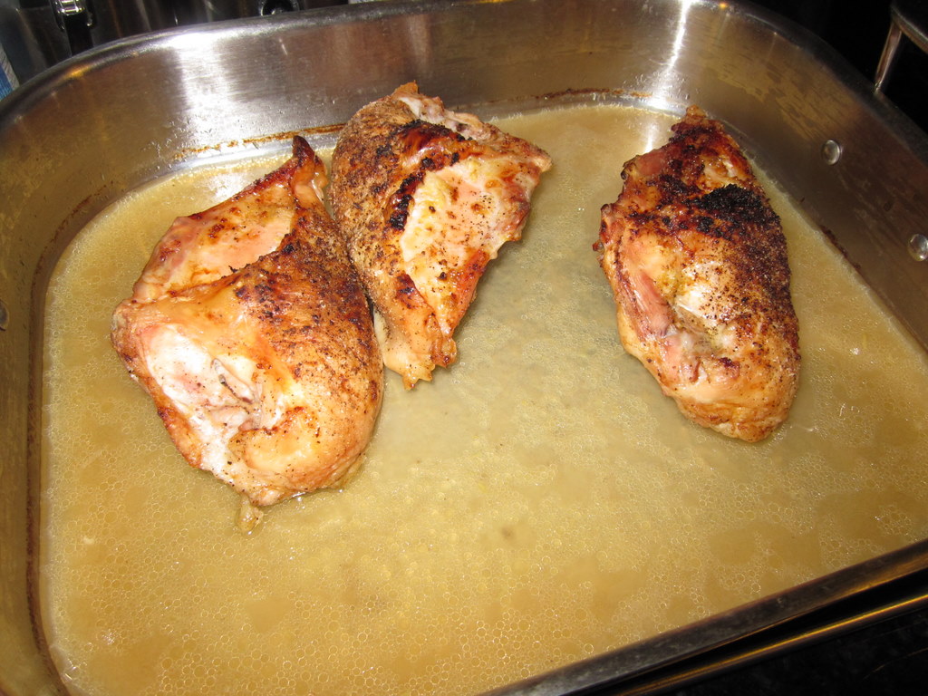 Liquid should just reach the skin of the thighs if you’re using a whole chicken, if it doesn’t add enough water to get there. I kind of eye-balled this with the breasts.