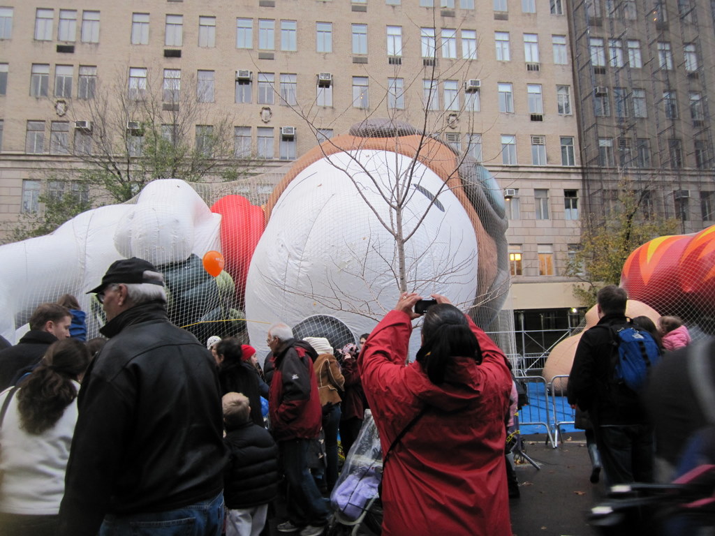 I have been running around like a headless chicken all week getting ready for the big Thanksgiving extravaganza at my house. Which actually means 6 adults and a 4yo, but I cooked all week and retrieved British in-laws from the clutches of the Newark airport. I am just now posting some photos from my annual trip to see the parade balloons inflated, which was pretty great because I’m keeping the tradition alive for baby H.