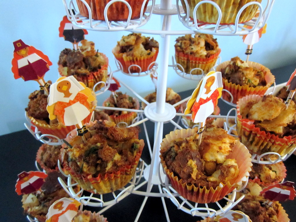 I relied on classics this year but did introduce some successful new stuff. Those cupcakes above are filled with stuffing. That was an idea from the Nov. ’11 Rachael Ray Magazine, once again I don’t even recognize myself anymore. I heavily used the Nov. ’11 Food Network Magazine this year, too. That stuffing was from the “Mix-and-Match Stuffing” article. I mixed paesano and pumpernickel bread, pears, and onion–no meat. I tore the bread with my hands so it was nice, big pieces. It was delicious, and it baked up in those muffin cups in about half an hour. Next year, though, I will nonstick spray the muffin cups first. I wasn’t expecting the stuffing to hold together that well, and the bottoms did slightly glue to the papers. But those were a hit, and they made the buffet look festive.