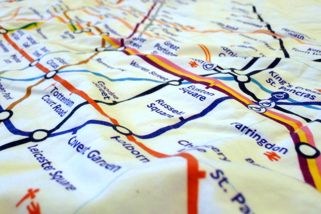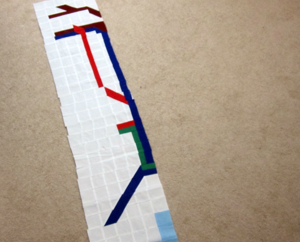 I am so in love with this quilt. Sometime in 2010 I had the idea to make Adam a British quilt for Christmas, but my original plan was to piece together a full version of the tube map in 2.5″ squares. Then for the back I was going to somehow get a big Union Jack. This is as far as I got before ending up on the verge of a nervous breakdown: