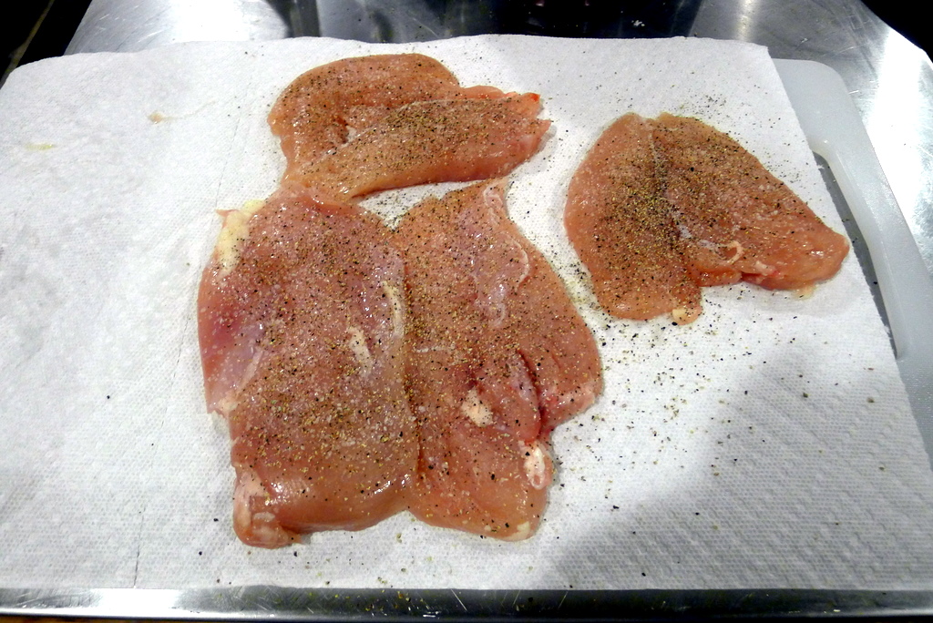 Slice each chicken breast in half horizontally to make 2 thin cutlets. Sprinkle lightly with water, place between two sheets of plastic wrap and pound until 1/4 inch thick. Season with salt and pepper. **Or just buy cutlets, like I did.
