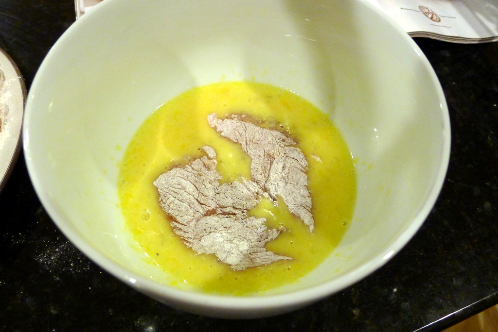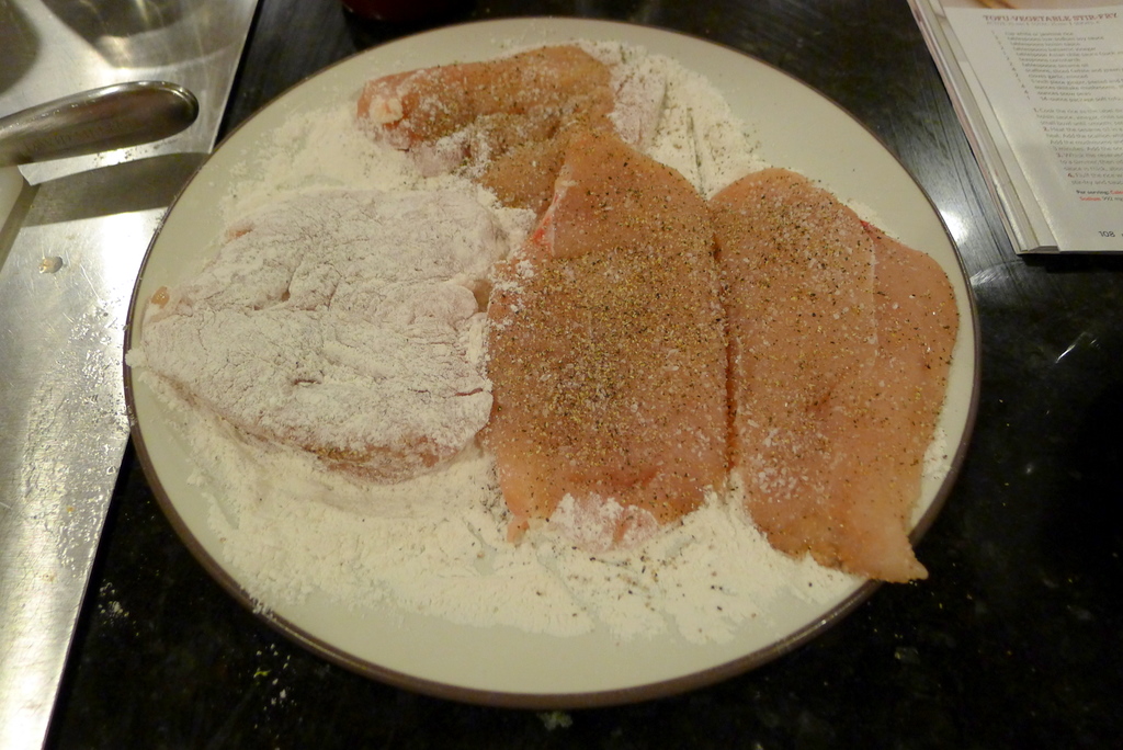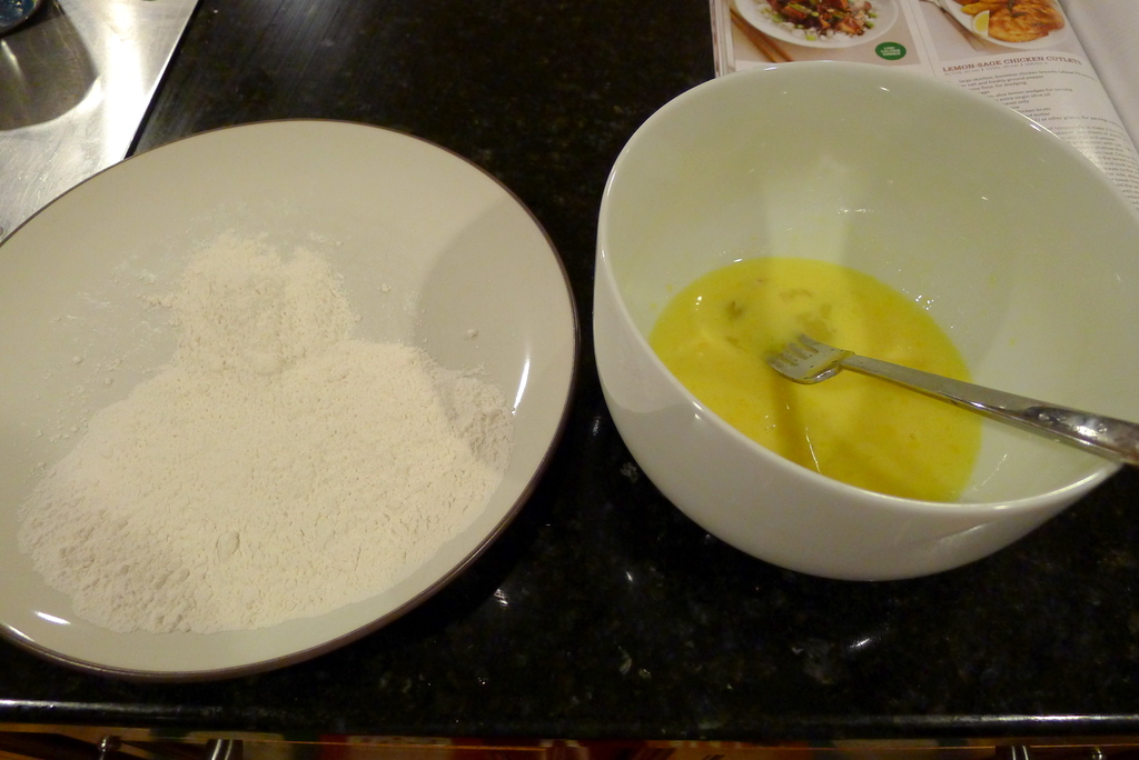 Pour some flour into a shallow dish and season with salt. Lightly beat the eggs with the lemon juice in another shallow dish.
