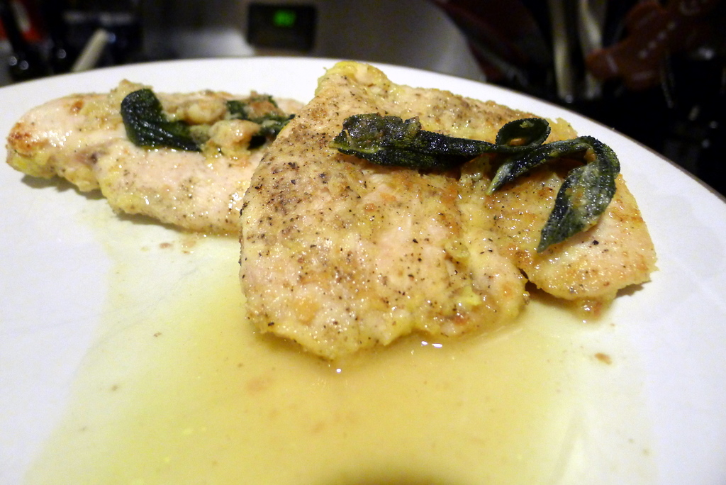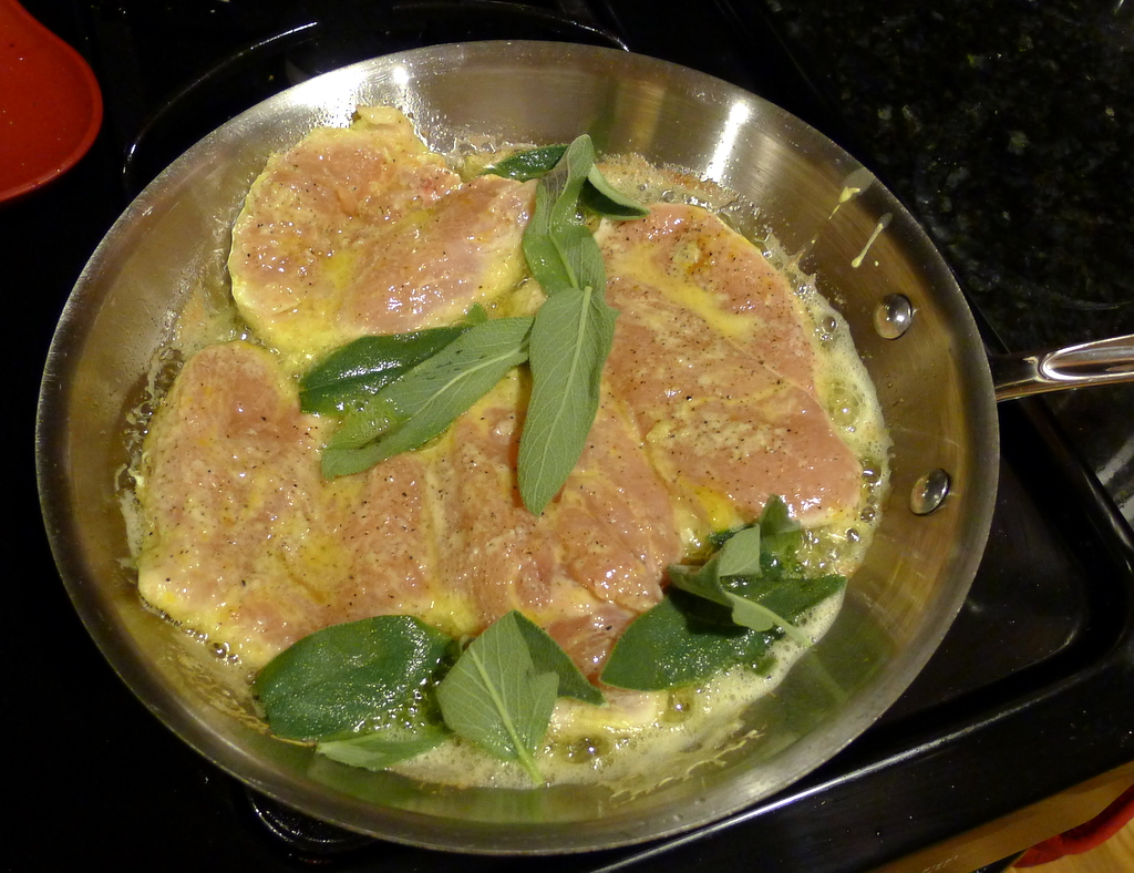 So here is the first new thing I’ve cooked in 2012. This is from the December ’11 issue of Food Network Magazine, and it was really quick and delicious. A lot like a piccata, but I liked the fried sage twist. I made lemon spaghetti with it.