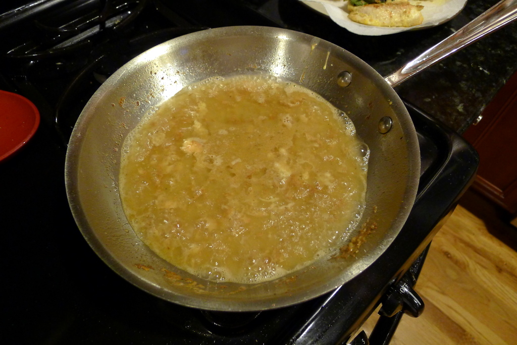 Pour out any remaining oil from the skillet. Add the wine and chicken broth and cook over medium-high heat until reduced by half, about 5 minutes.