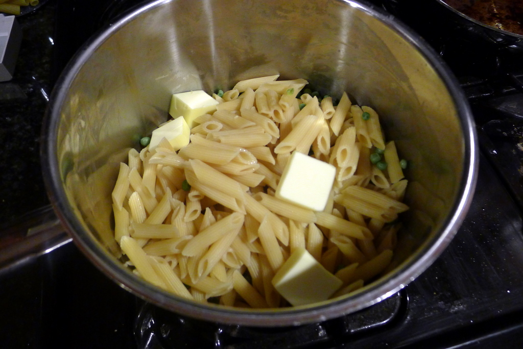 Drain the pasta and peas; wipe the pot dry and return the pasta and peas to the pot. Add the butter and stir to coat.