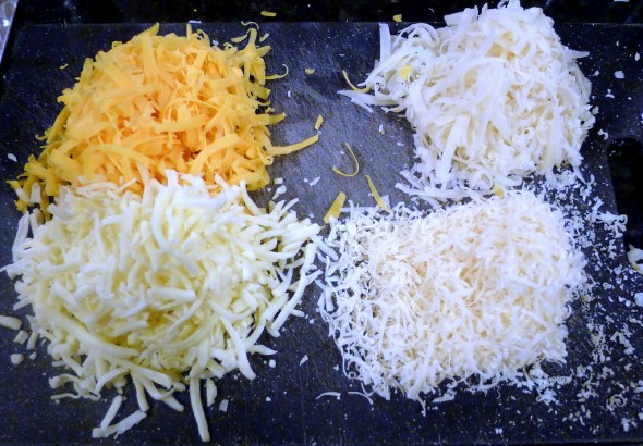 Add the cheddar, mozzarella, fontina and the egg mixture.