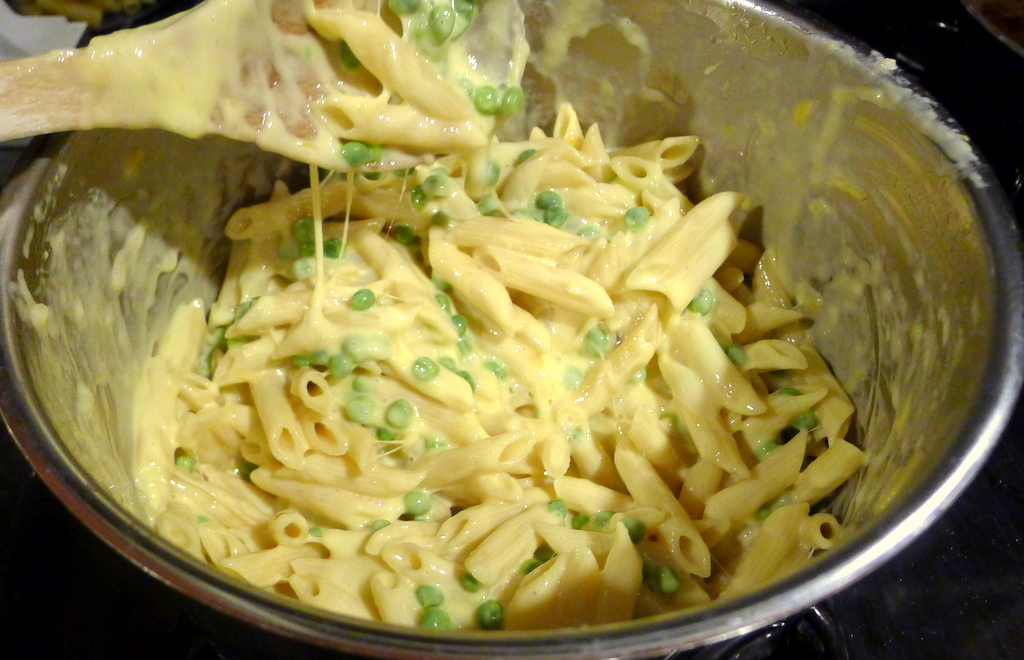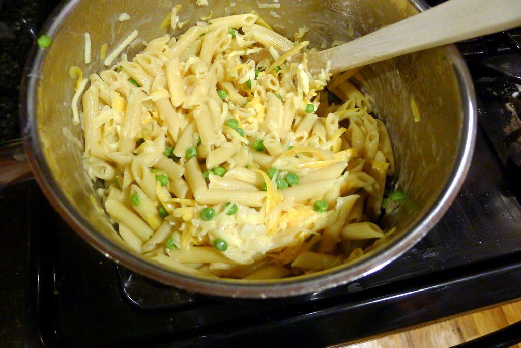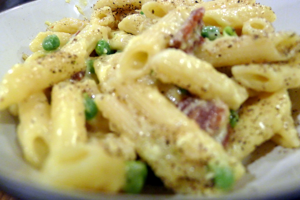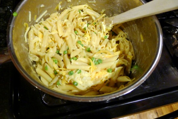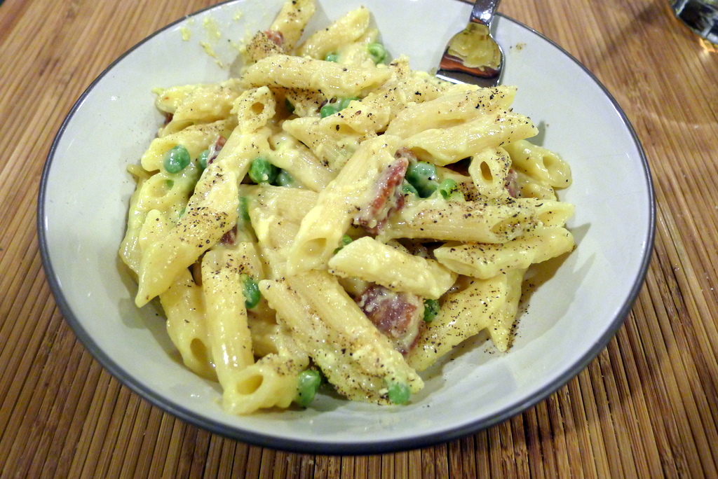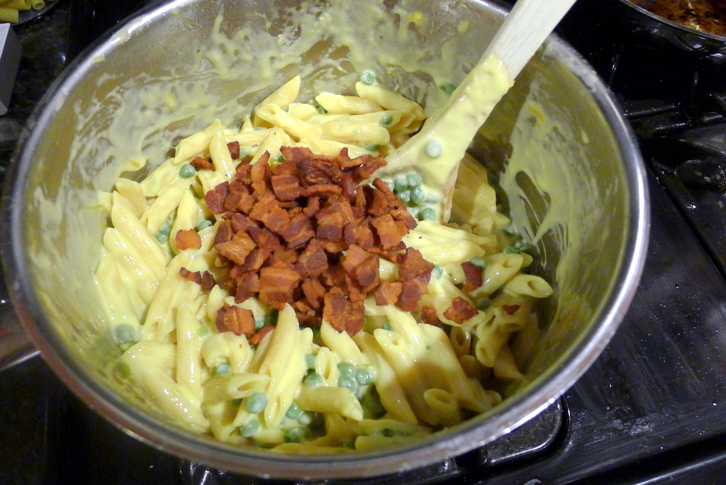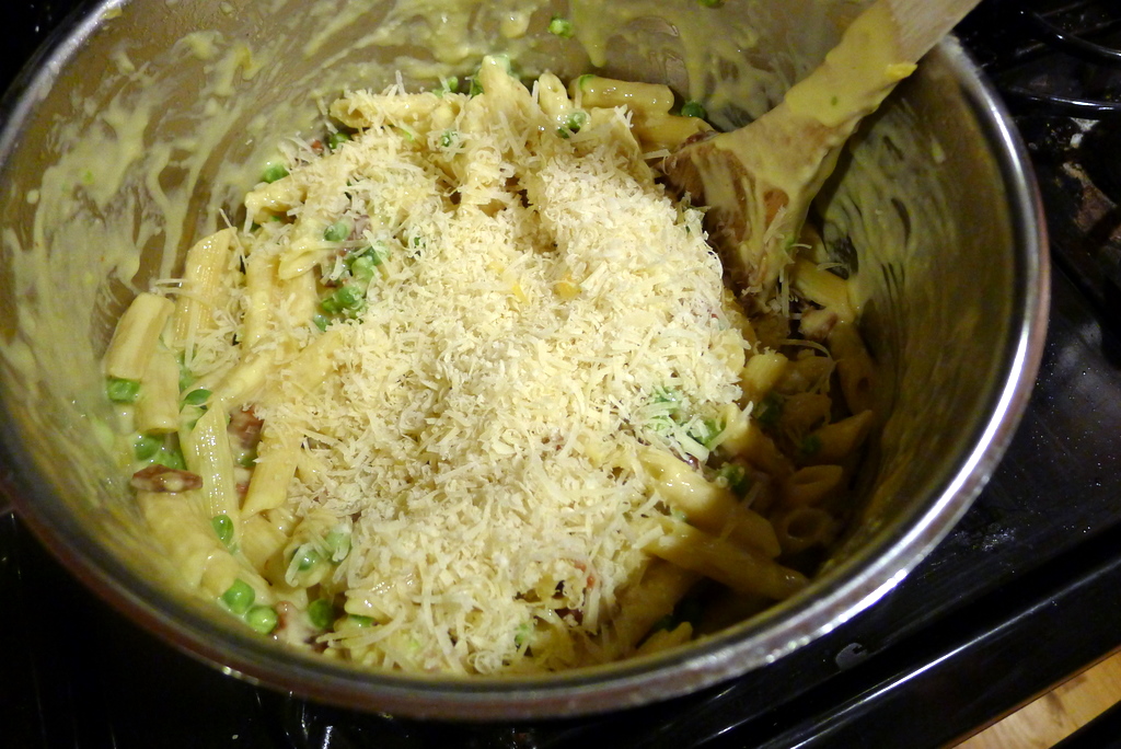 Four-Cheese Pasta with Peas and Bacon (adapted from the December ’11 issue of Food Network Magazine)