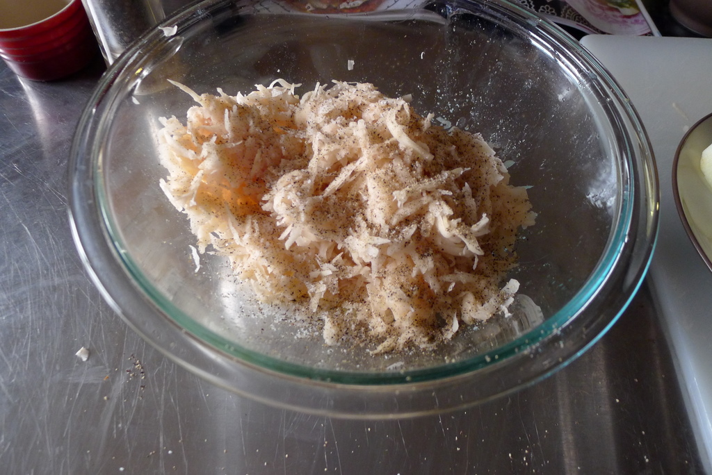 Transfer to a clean kitchen towel and squeeze out as much liquid as possible. In a bowl, combine the potatoes with the 2 tablespoons of melted butter and season with salt and pepper.