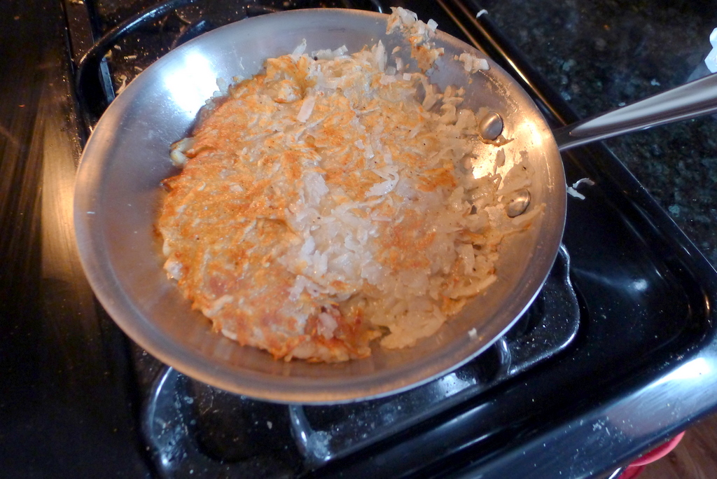 In a small nonstick skillet, melt 1 tablespoon of the butter. Add half of the potatoes and pat them into a disk about 1/2 inch thick. Cook over moderately high heat, turning once, until golden, 3 minutes per side.