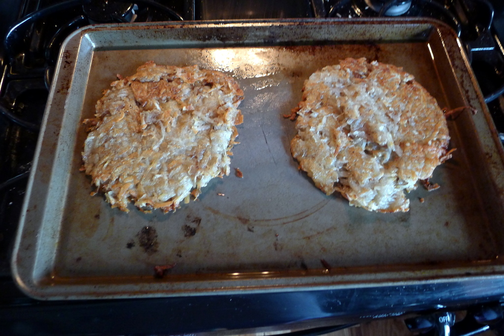 Preheat the oven to 425°. On a box grater, coarsely shred the potatoes.