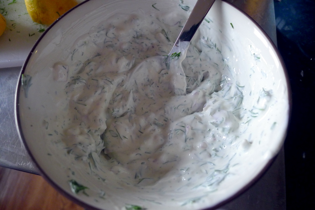 In a bowl, stir the sour cream with the onion, dill, and the 2 teaspoons of lemon juice. Season with salt and pepper. Whisk the mixture until thickened, about 30 seconds.