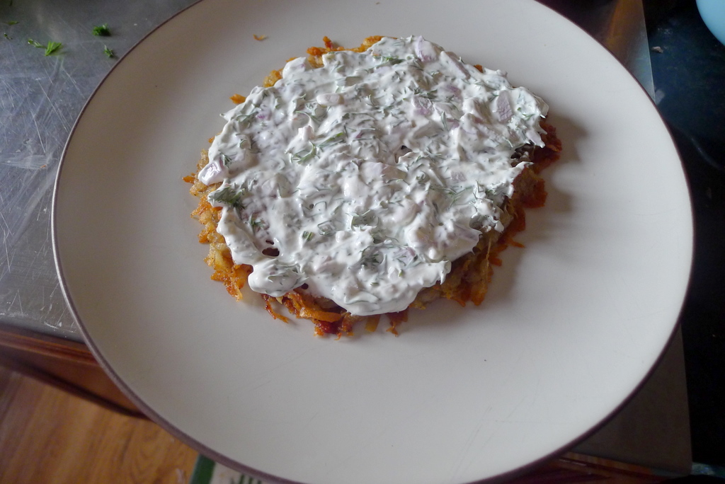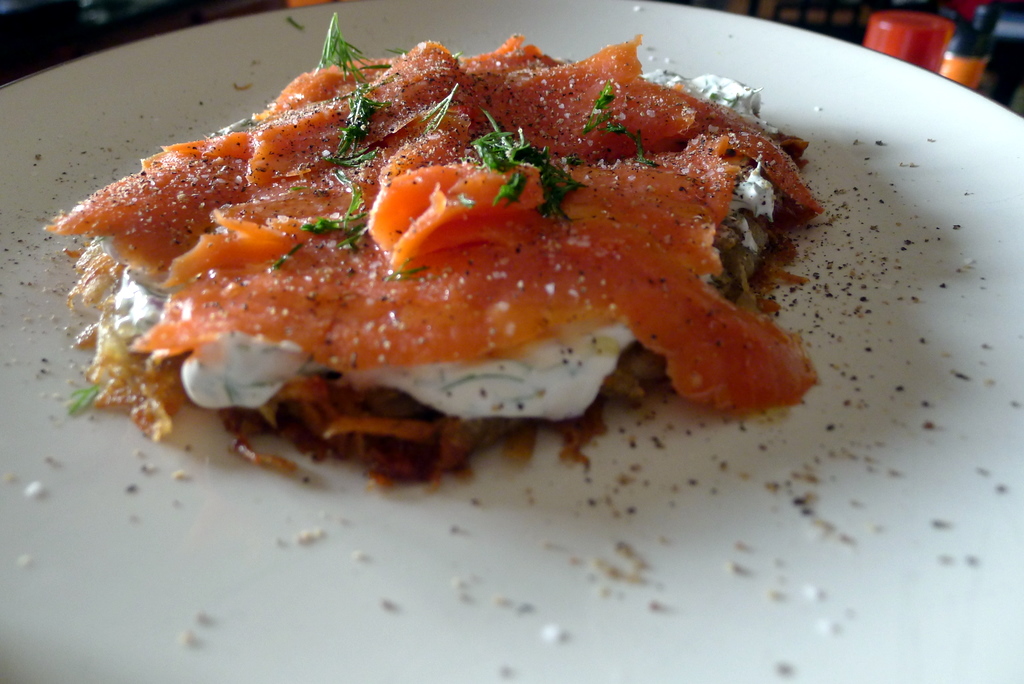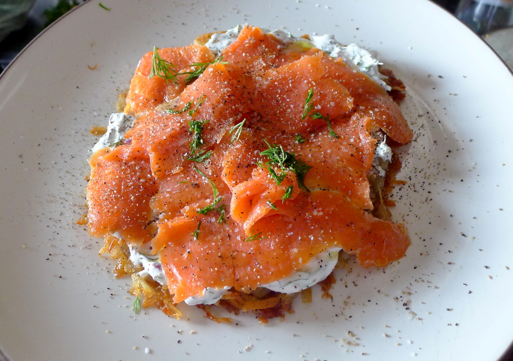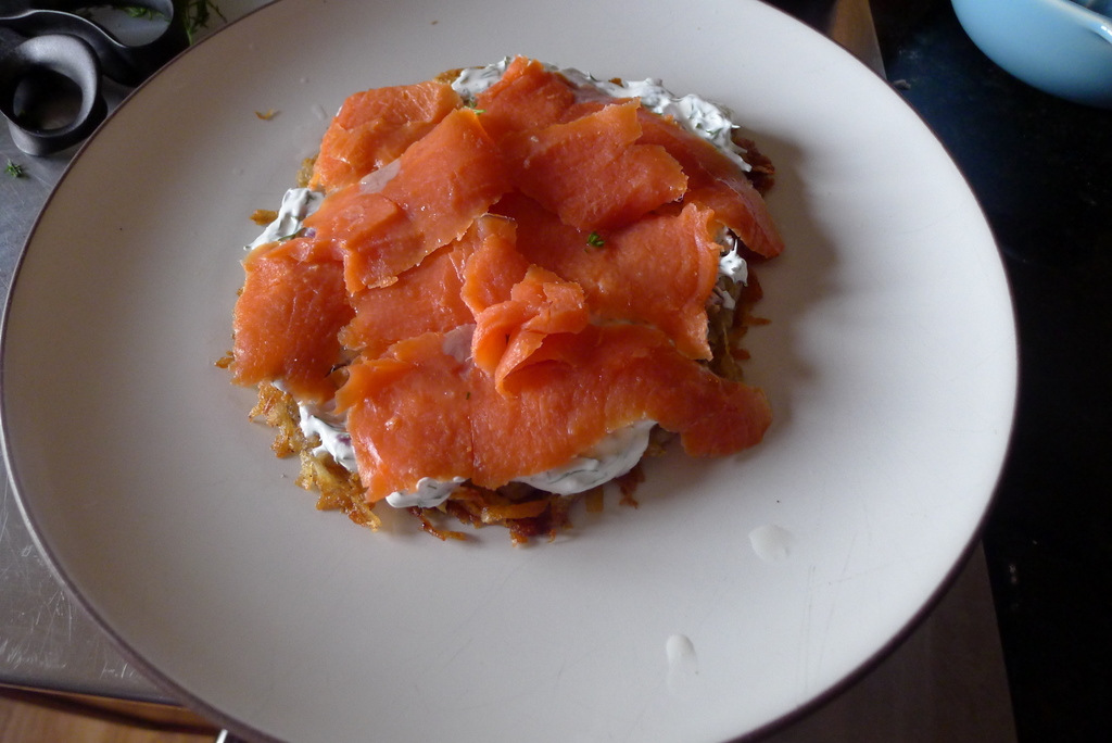 Crispy Potato Galette with Smoked Fish and Dill Creme (adapted from Wolfgang Puck’s recipe)