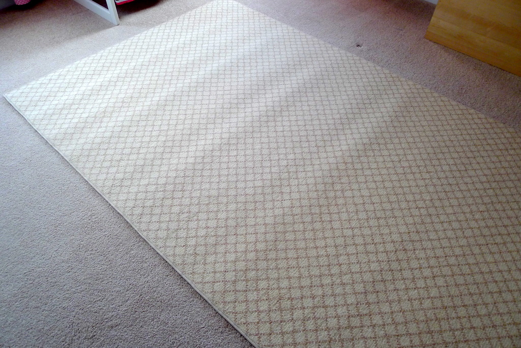 I found this finished remnant at a local carpet store after Adam suggested looking there. We needed a 5×7 or 5×8 area rug to cover the dark blue paint drips on the carpet from when we moved in and I painted the guest room (who knew canvas tarps leak?). We were going to buy this rug, but in the end I bought this excellent wool remnant for $100. And I actually like it so much more.