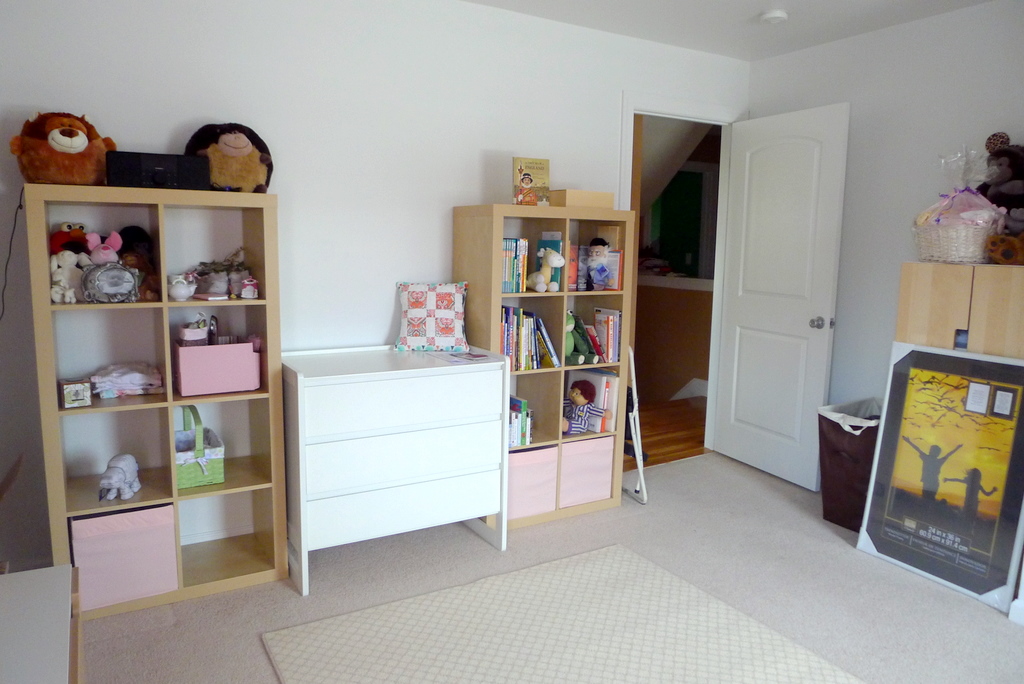 We also got 2 IKEA Expedit units for H’s room, which we’ve filled with books and toys to surround her dresser/changing table.