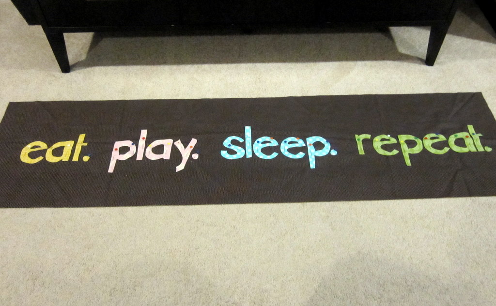 Next I’ll iron the letters down, and I think I’m going to do a tight zigzag stitch in contrasting threads around all the letters. The original tuturial didn’t do this, but I think it will help add more punch. Then I’ll play with the size to decide if I want to trim down the brown and add other fabrics around the edges, or just quilt it and bind it off as is. We’ll see.