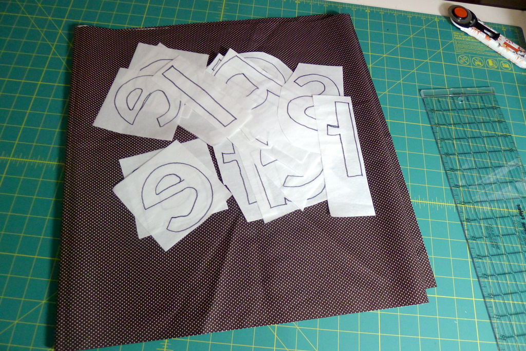Now I’ve gotten all the letters cut out and arranged on the background fabric (I worked on it during my lunch at school this week). They are pinned in place and ready to be ironed on following Vanessa’s tutorial.