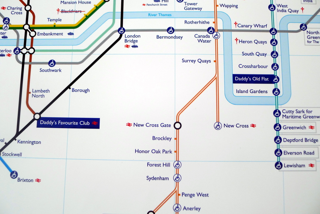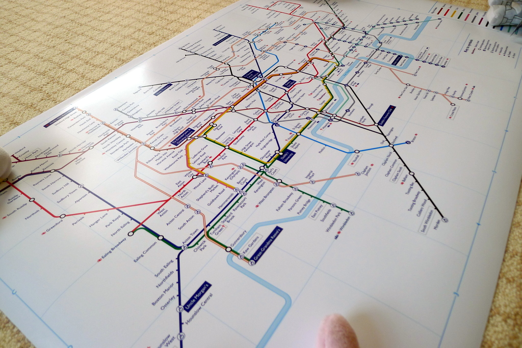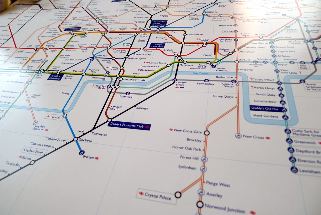 I got in touch with Adam’s family, friends, former coworkers, etc. and asked them to help me identify the best tube stops to represent Adam’s life in London (his university, his old apartment), and the stops of his family members–his 2 brothers, his grandparents, the stations he takes to get out to his parents’ homes. They came up with a great list, and Morgan very patiently added the locations and sent the file to me. I had it printed at Graphic Lab Inc. in Manhattan, and my mom stealthily picked it up and delivered it to me Christmas Eve.
