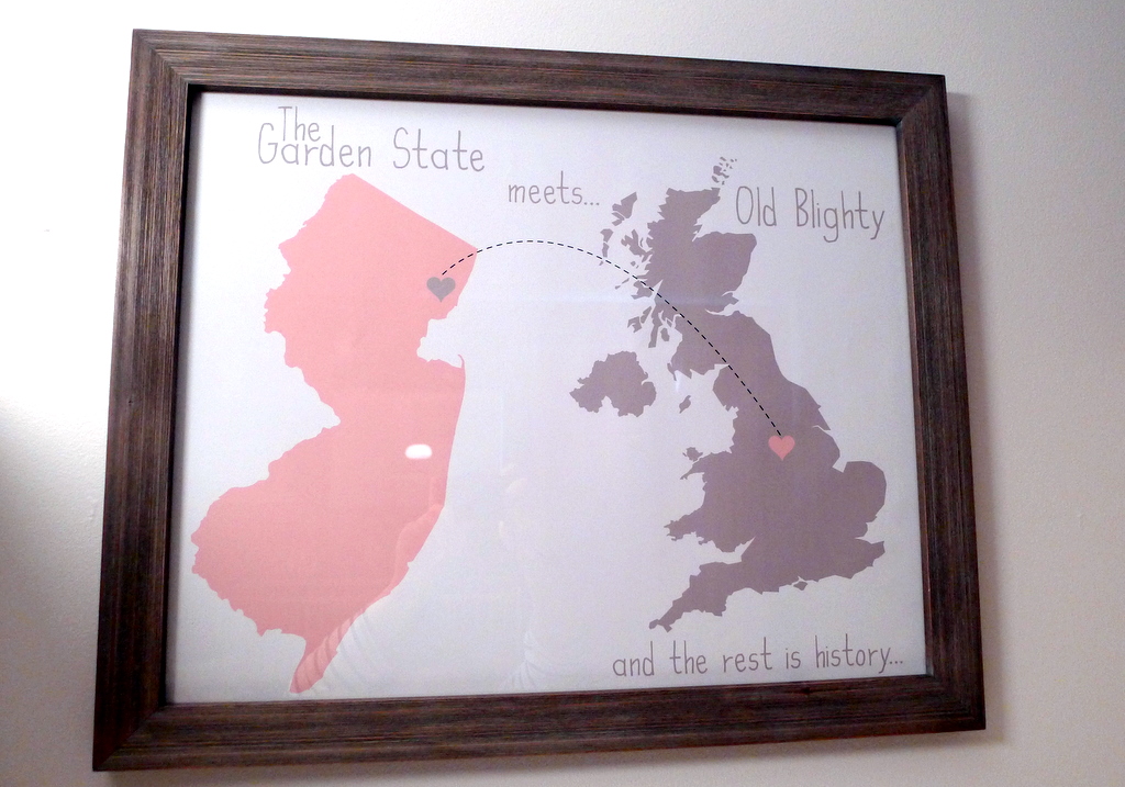 I’m in love with this custom 16 x 20 print we bought from Arthur’s Plaid Pants for H’s room. I love everything about it. I love how NJ is like Godzilla to the entire UK, I love that it’s pink and grey, I love that it’s a piece of H’s whole heritage, I love that Northern Ireland is floating on its own out there. Jen did such a terrific job on this, my only regret is that I didn’t think to take photos of the print before we framed it and hung it up. Made it a bit tricky to get a decent shot without my entire reflection in the glass. But I think you get the general idea, this is one of my favorite touches in the baby’s room.