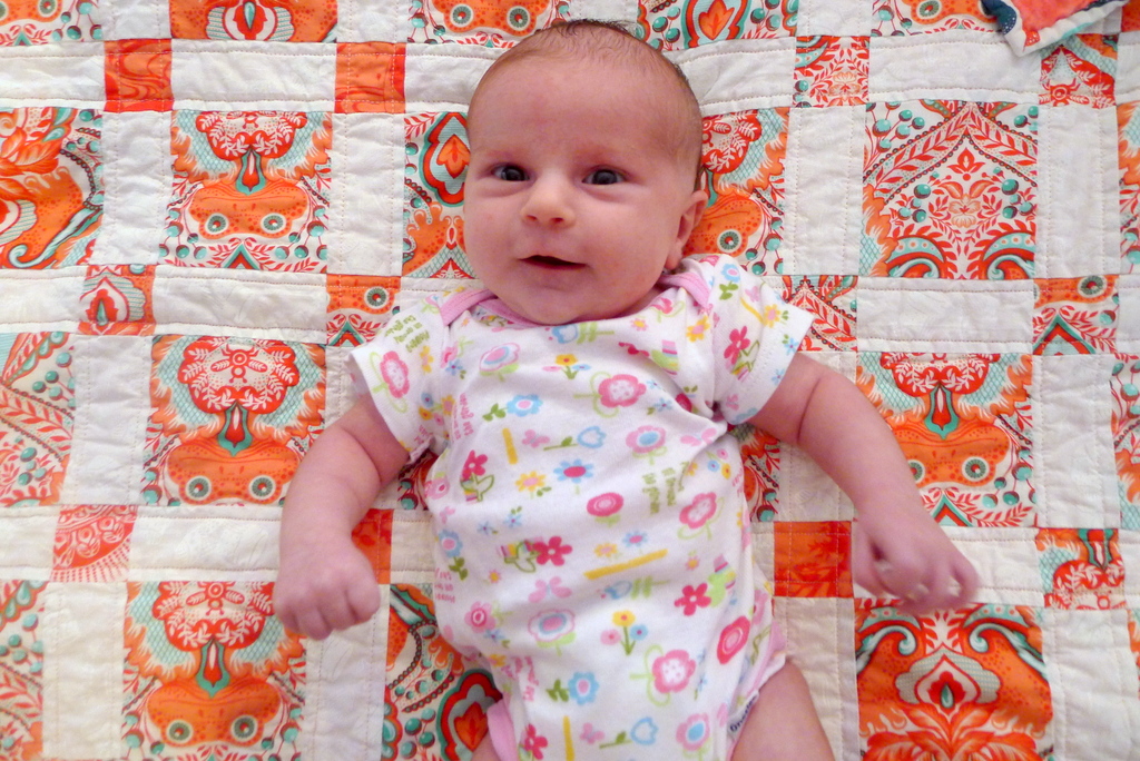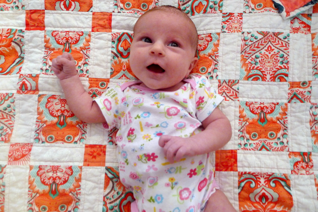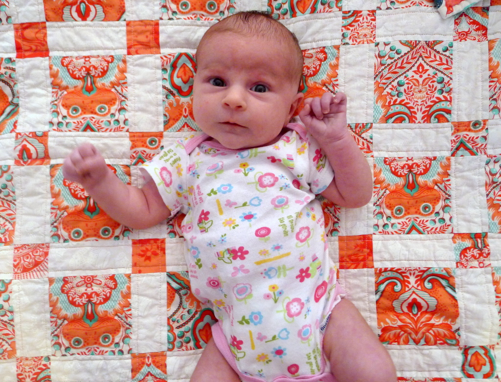 I spend a lot of the day camped out upstairs on our bed with her lying on this fantastic quilt my mom made for her with my stash of Tula Pink’s Prince Charming fabric. She squirreled some away while making my school bag, and it’s H’s favorite place to hang out. One of these days I’ll remember to take photos of the other quilt my mom made her, which is her downstairs playmat.