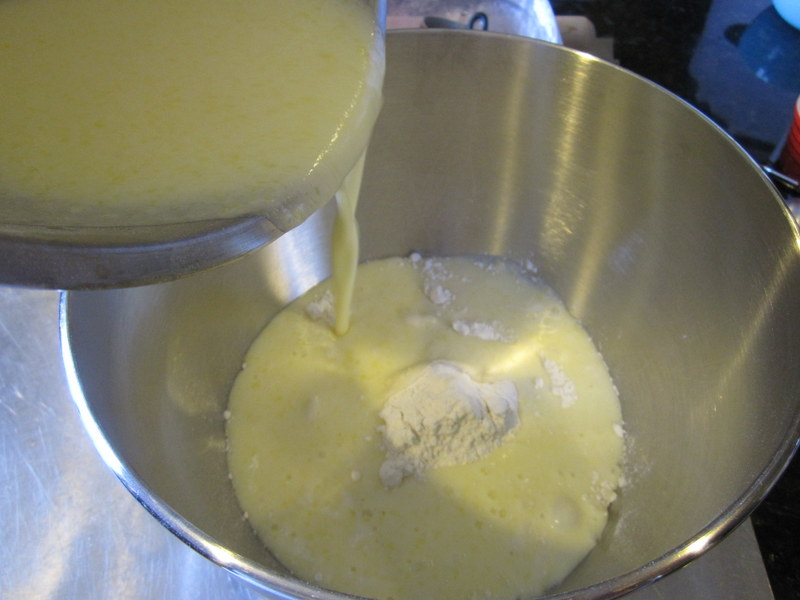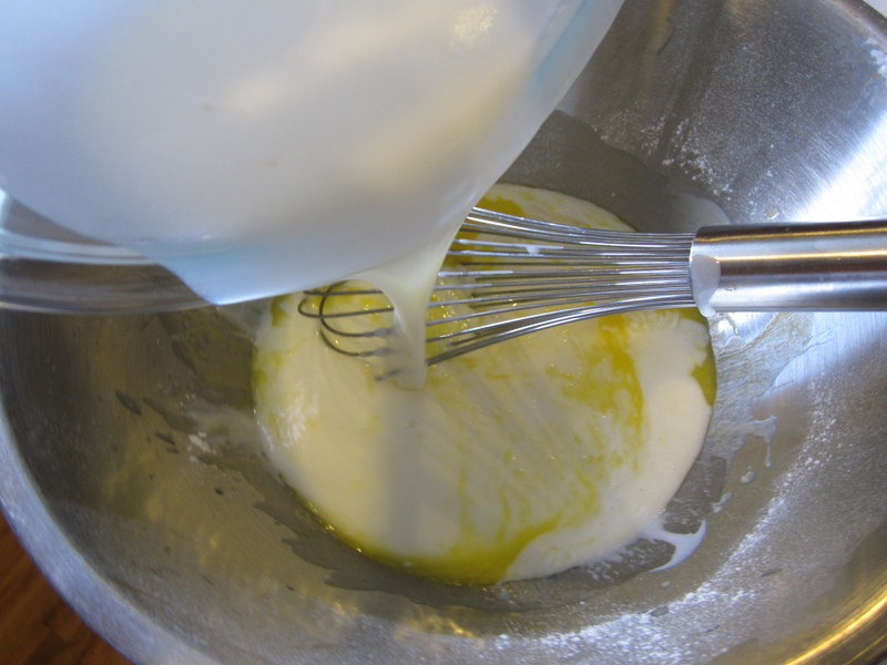 Combine the buttermilk mixture with the egg yolk mixture in a large mixing bowl and whisk together until thoroughly combined.