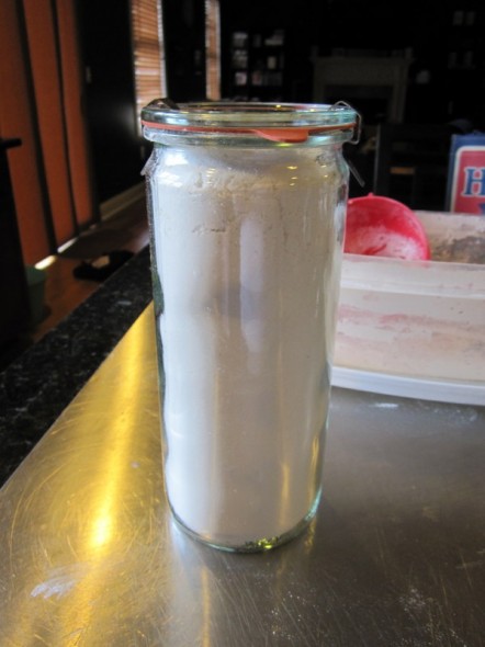 **The mix will make 3 batches of pancakes if you follow his recipe below. I scooped out the amount of mix I needed for this batch of pancakes and stored the rest in one of my Weck jars.