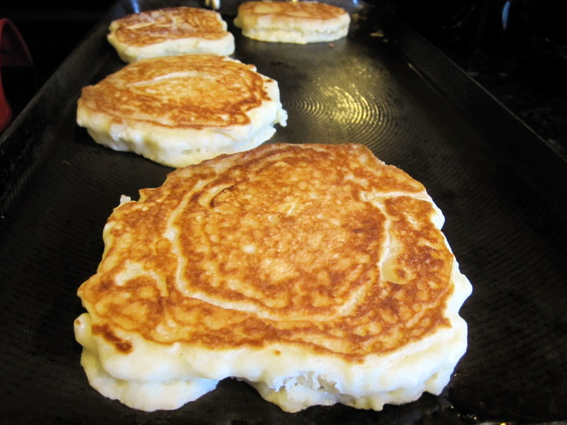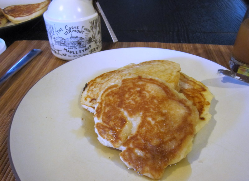 So I haven’t actually tried to make pancakes since college, and I graduated 10 years ago. I’ve learned a lot about cooking since then, but pancakes have remained on my Things to Fear in the Kitchen list anyway (along with things like rice and pies, both of which I’ve now conquered). Adam has been dropping hints about how much he’d love to see pancakes in the recipe rotation for years, but it wasn’t until Laura Ann gave me some real Vermont maple syrup a few weeks ago that I decided to give it a try.