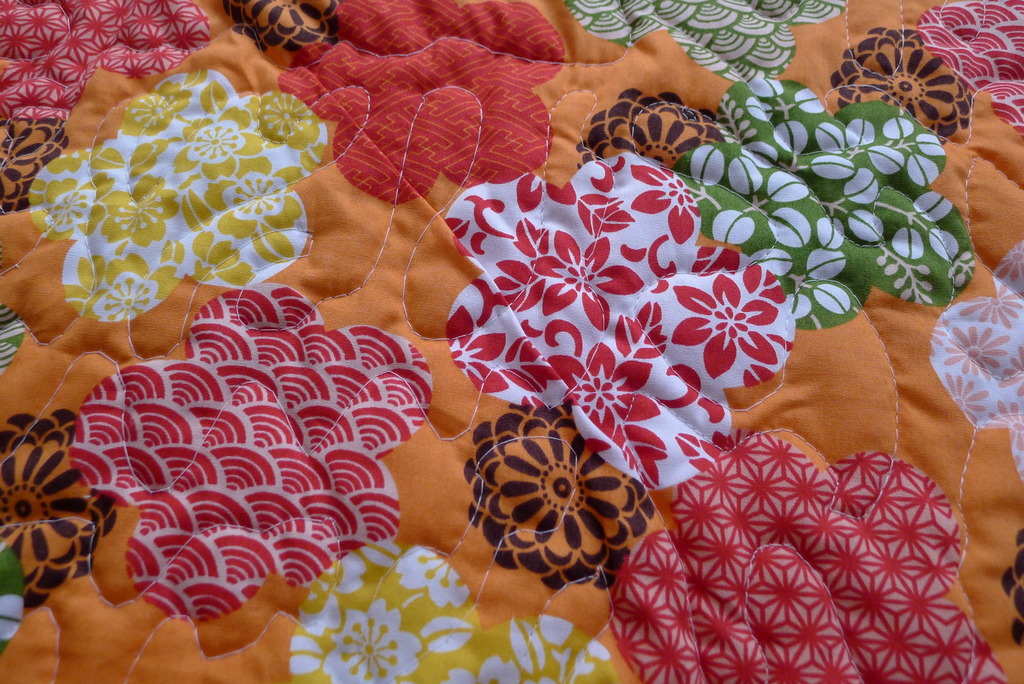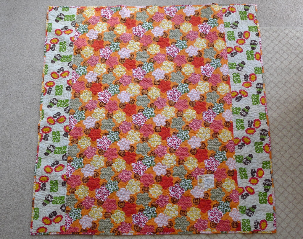 I’m even happy with the binding, which is the same orange fabric from the backing. My mitered corners still aren’t perfect, but they’re getting better and better.