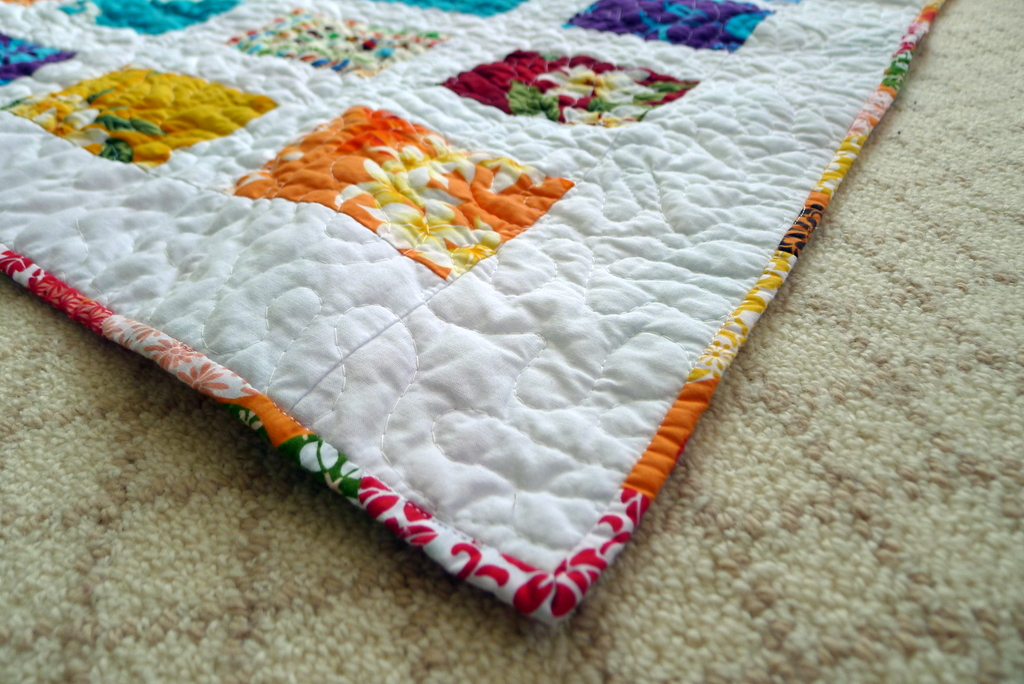 So I made this quilt for my sister-in-law Kathryn, who is expecting her first baby in just a few weeks. H can’t wait to meet her little cousin CJ, but since he’s been getting all the attention (and quilts made by my mom) I wanted to make something for Kathryn during her hospital stay. I brought my Rainbow Quilt to the hospital when H was born, and I was so glad I did. It made such a difference to have something personal and cheery to liven up the depressing side of days spent in the hospital.