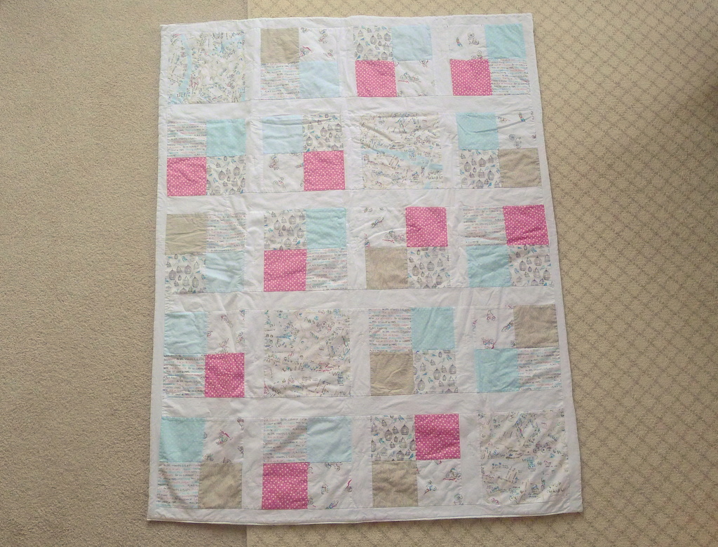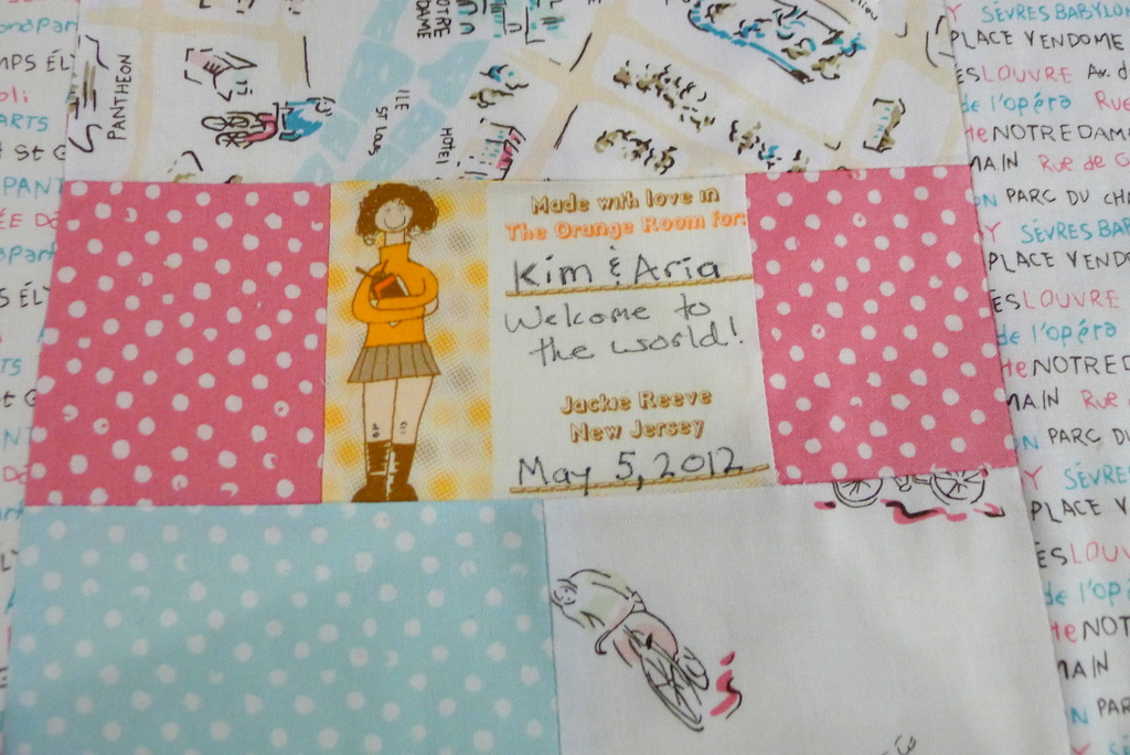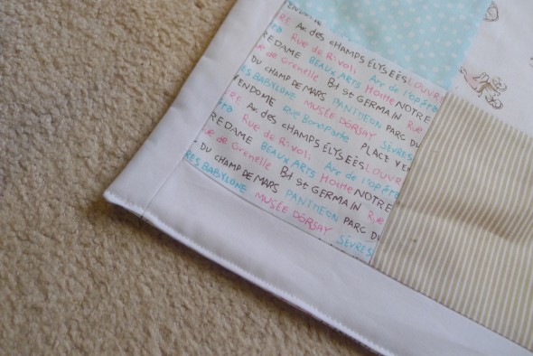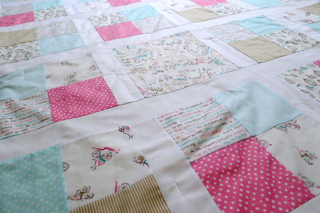 I’m really pleased with it, I wasn’t sure how all the white sashing next to white backgrounds would look. I think it’s actually pretty cheery, but a little hard to take quick photos of. The fabric is the J’adore Stella line from Dear Stella fabrics. I wanted something baby girly but not teddy bears and princesses. I just made some 4 patch blocks with each of the 4 patches cut to 5″ square, so they came to about 9.5″ square for each finished block. And I used the map print from the line to cut out some single 9.5″ squares to break up the 4 patches a little bit. I used some Kona Snow jelly roll strips that I already had.