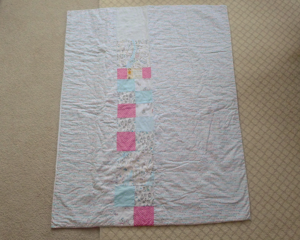 I worked on this quilt so quickly that I haven’t even done any other posts on it. I finished this a couple of weeks ago for one of Adam’s coworkers, whose baby girl was just born 3 months premature. I thought she could use something for those days and nights in the NICU.