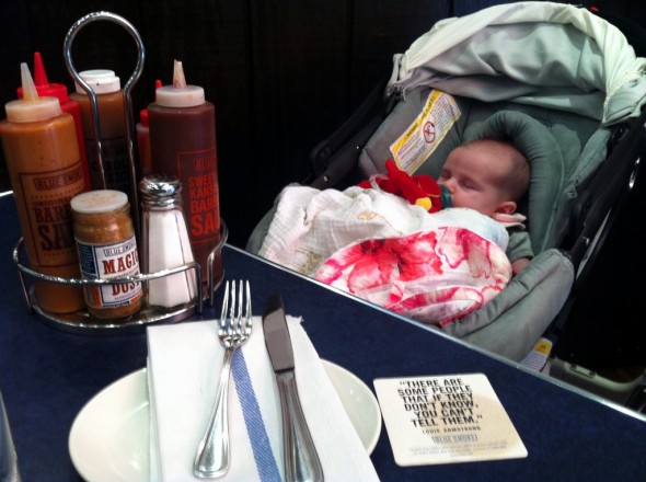 I ducked out about halfway through the meeting so Adam, H, and I could grab lunch downtown before he officially he had to report to work. She slept through most of her first trip to Blue Smoke (the downtown outpost).