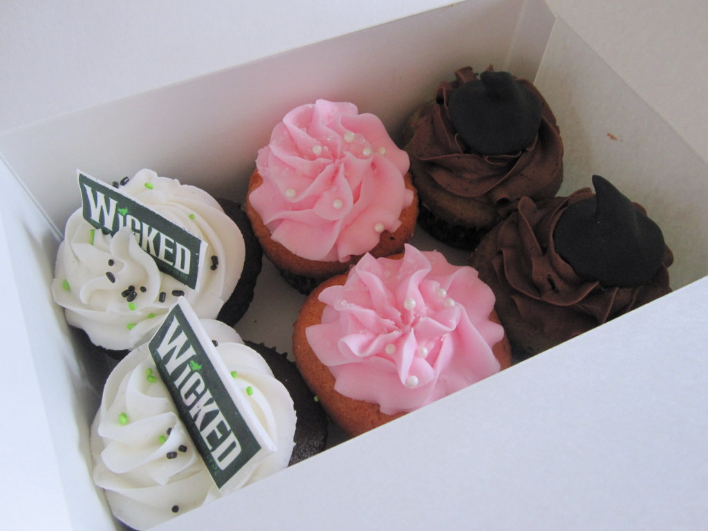 They also give a lot to charity, and for the month of June you can buy these special edition Wicked-themed cupcakes. Chocolate, champaigne-infused pink-dyed, and mint with chocolate frosting. They are yummy, and $.75 from every one goes to The Trevor Project. We. Will. Eat. Cake. For. Excellent. Causes.