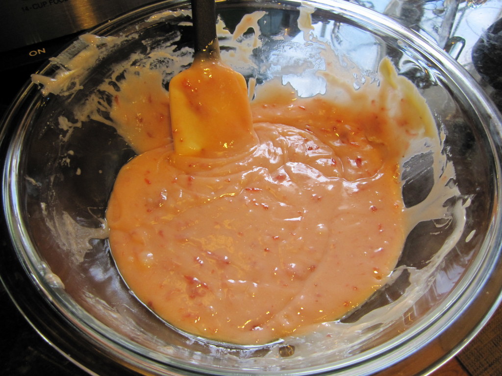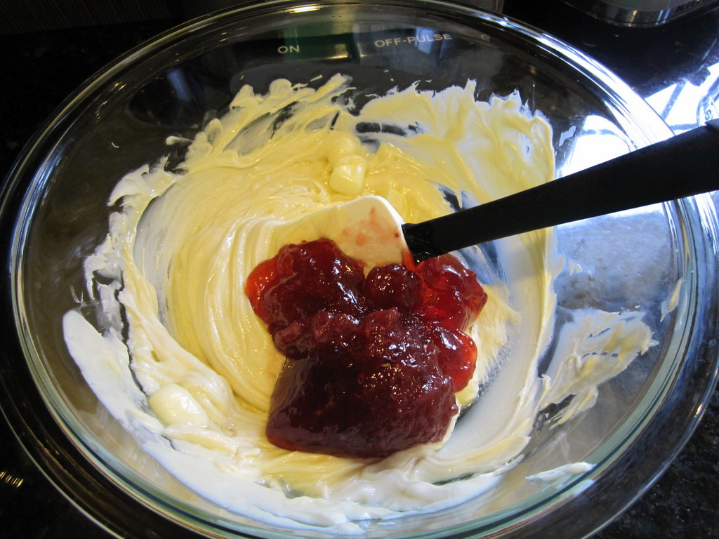 Stir the softened butter and strawberry preserves into the melted chocolate until combined.
