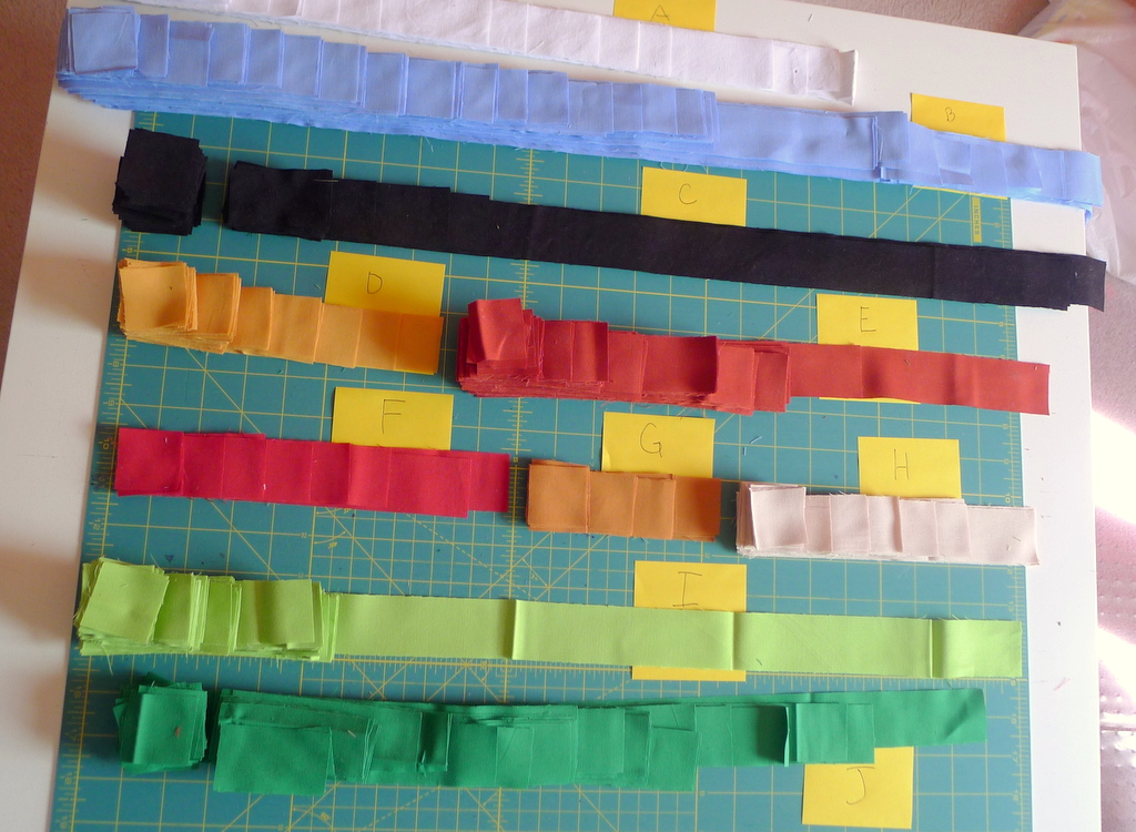 Clues: Fabrics are all solids, not prints. Many strips are cut, no triangles, maybe some rectangles.