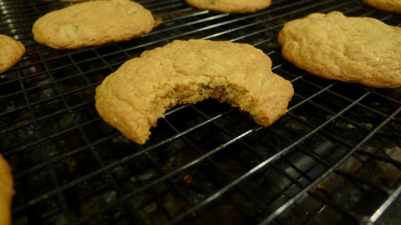 So let’s move on from my fruit experiments and talk about something really important. I LOVE chocolate chip cookies. But I hate when they get hard and crunchy within minutes of being out of the oven. I like soft and chewy cookies, with a little crispness on the edges. And I’m often looking for recipes that will produce this result, but I’m not really successful. Even the classic Toll House cookie recipe gets too hard too fast (which is why I only like making that recipe as a bar cookie–those DO stay soft!)
