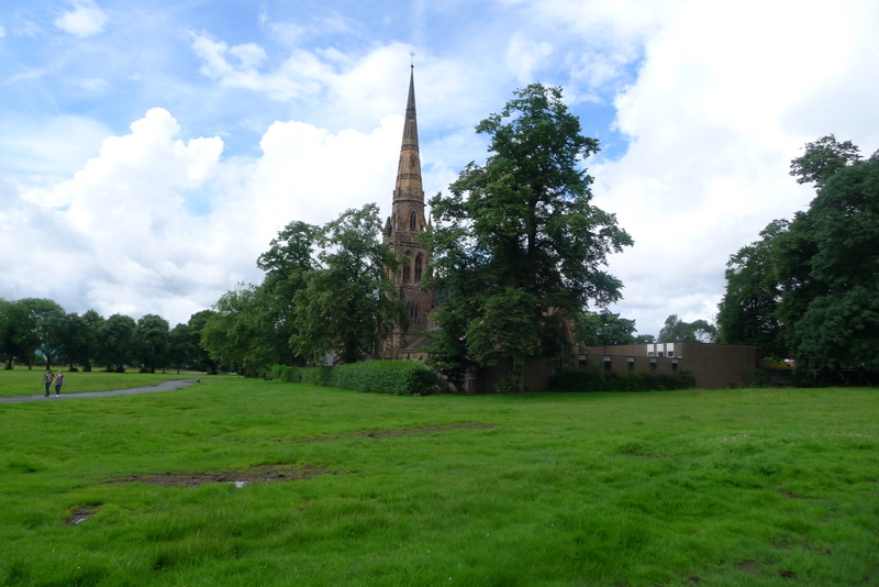 On Sunday we met Cora and Ian at the Manchester Gallery of Costume, a very cool little place that I failed to take any pictures of at all. Except for this shot of the beautiful park and church behind it.