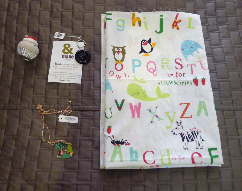 These were my goodies from our day out: a pincushion and button keychain from & Made, the alphabet fabric from Abakhan, and this very cool necklace that screams Children’s Librarian from Junk Shop.