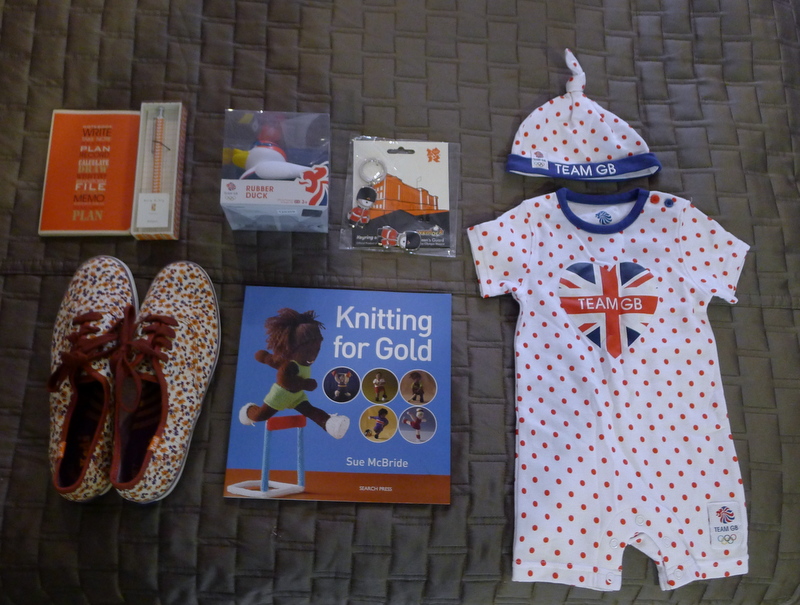 What about the Olympic stuff? That’s what led me to this store in the first place. I’d wanted to bring back goodies from the London 2012 games for my niece and nephews, and when I researched I found that this chain was carrying a huge selection of the merchandise. I did buy the kids some souvenirs, but I couldn’t resist some stuff for us, too. I don’t know when or how I will be knitting miniature gymnasts and shot putters, but I could not in good conscience leave the store without that book.