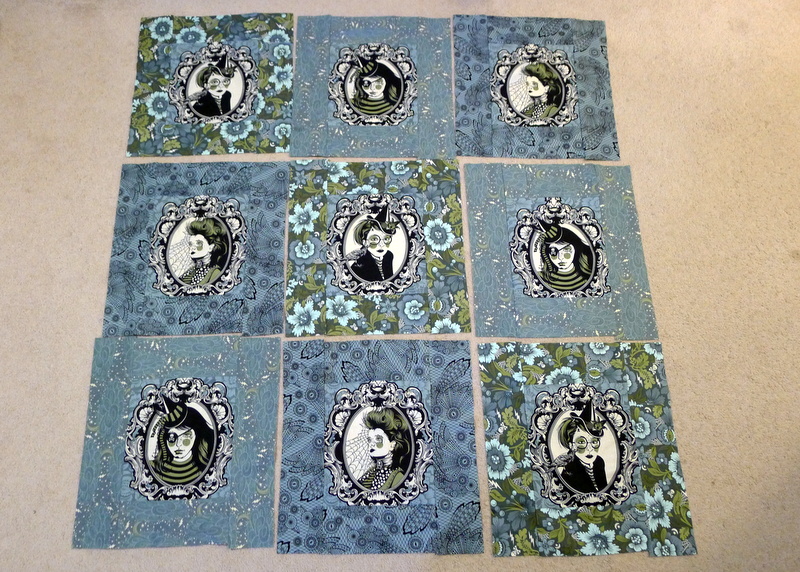 I bought the fabric for the witches, I adore them. But I just bought half yards of the other fabrics and am not sure what to do with something this small (it’ll probably end up smaller than 4′ square at this point). I’m never good at making quilts just to make them, I always need a purpose. I have a much lighter 5th fabric for the backing (the Apothecary print), and I’m trying to decide if I should use it as sashing between these blocks, to make this closer to throw size and add a little dimension and contrast. As it is now, I feel like the blocks aren’t distinctive enough on their own.