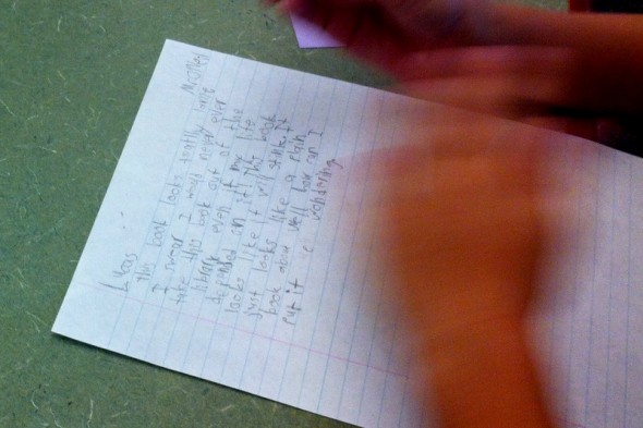 And so to start it with the 4th graders, I asked each of them to write a paragraph predicting what it would be about and whether they thought they’d like it based solely on the front cover. I didn’t tell them anything else about it in September (other than how awesome it is), and they had to tell me if they would pick it up if they saw it on the library shelves. And they were right on me, reminding me that in second grade I’d specifically taught them not to judge a book by its cover. They totally got this right away. So I gave them 5 minutes to write, and then we shared our thoughts. Most of them didn’t think this would be a book they’d check out on their own, and most of the boys thought it would be insanely boring. I think Lucas’s response below sums up some of the strong feelings the students had based on the cover: