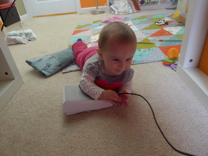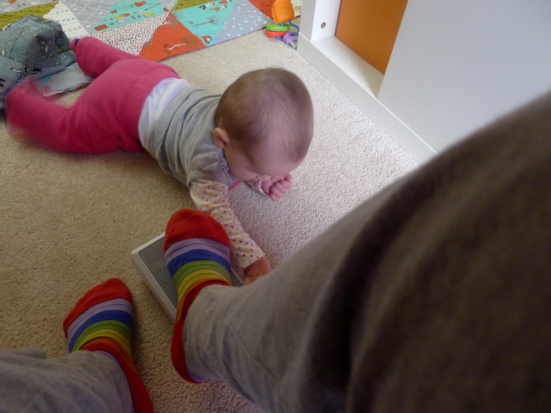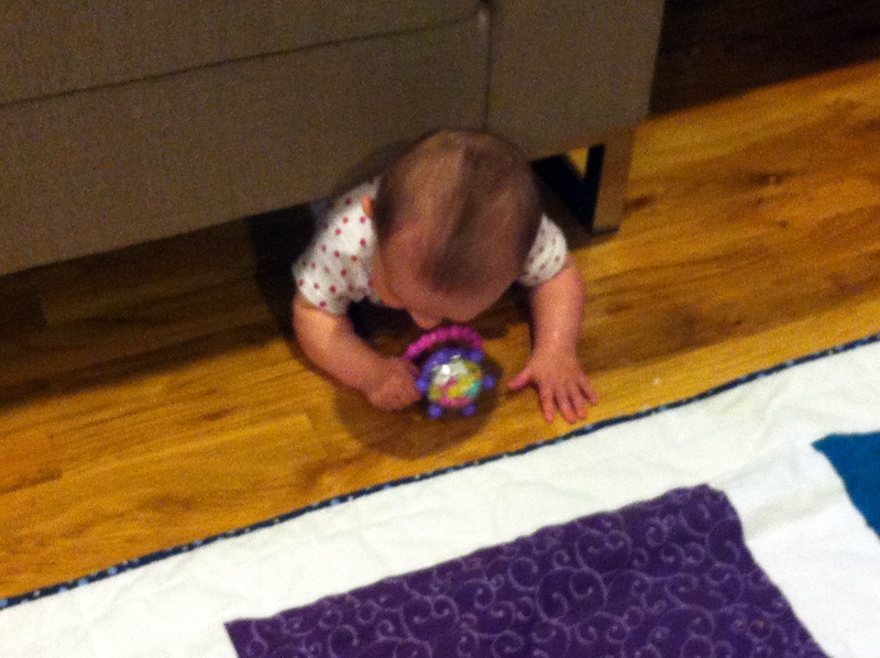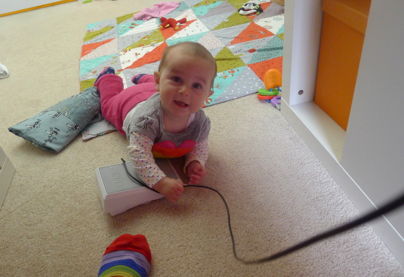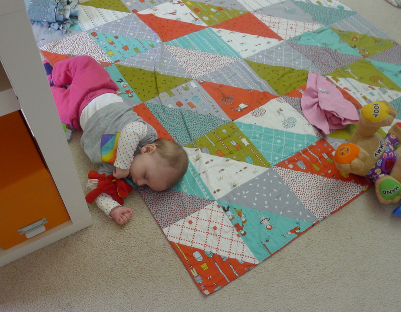 Look at that twinkle in her eyes, she knew what she was doing. She dragged it back towards her Little Apples quilt (her current play mat), so when I went to put my foot back on the pedal without looking it was nowhere to be felt.