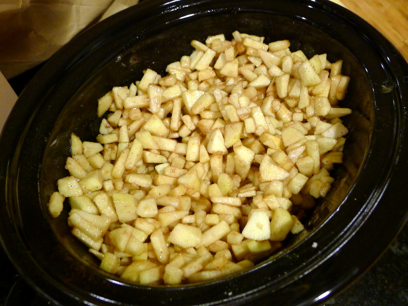 Peel, core, and chop all the apples into small pieces. Put them in your slow cooker.