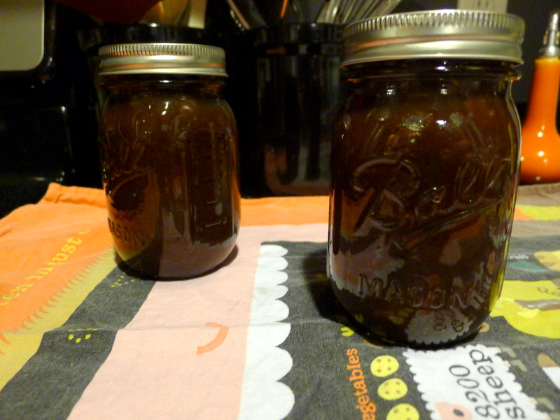Now, I was going out with Laura Ann for the day at this point, and I knew it needed to cook longer but also knew Adam had a whole day to himself planned. So I put it back on low for 8 more hours while I was out, with the lid back on. When I came home, it was glorious and molasses colored, and to me that was perfect. I like it thick, and this is still really velvety and spreadable–not overly thick. So then that night I processed it into 2 jars the same way I process everything else.