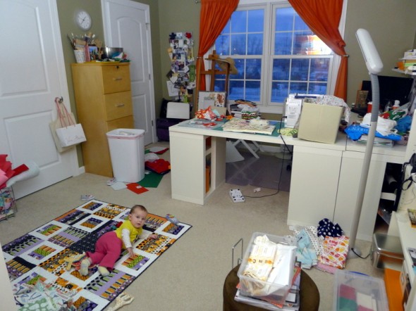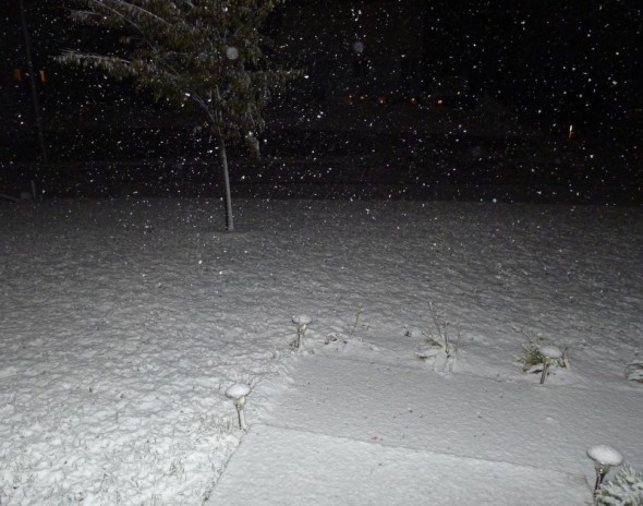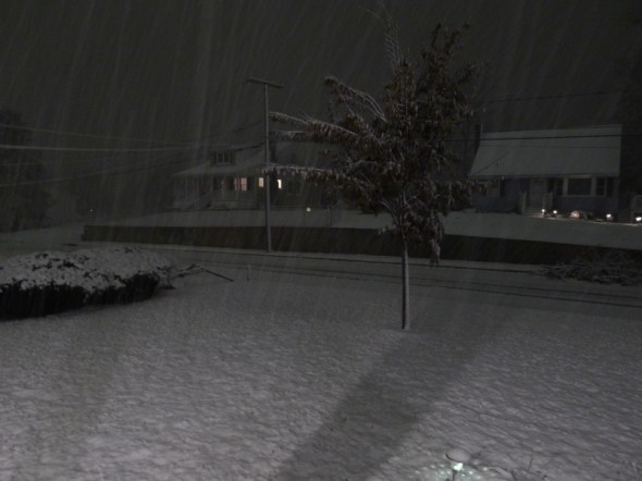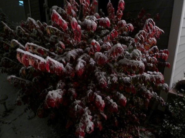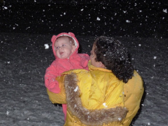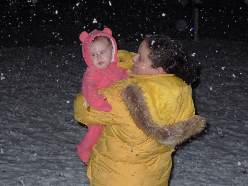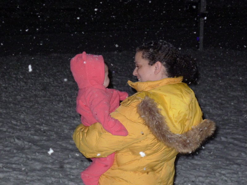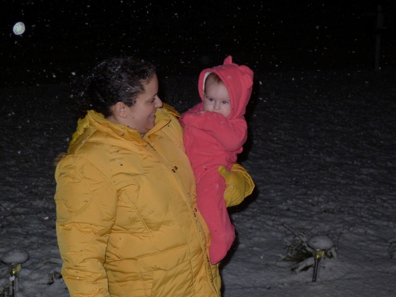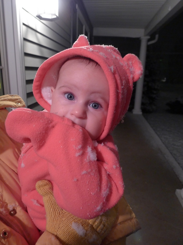 I just posted some photos last night from our storm week, and it was snowing like crazy. I bundled H into her new snowsuit (if that’s even what you call this), and we took her outside for her first real snow experience.